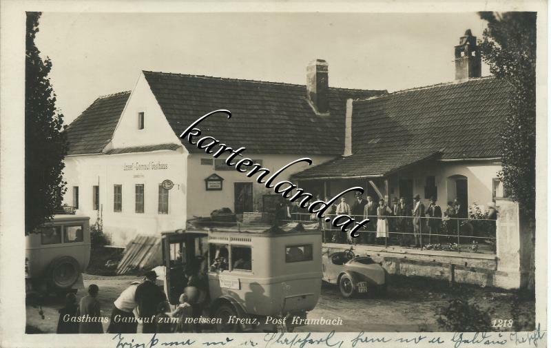Gasthaus Josef Gamauf "Zum Weißen Kreuz", Personen und Oldtimer vor dem Gasthaus